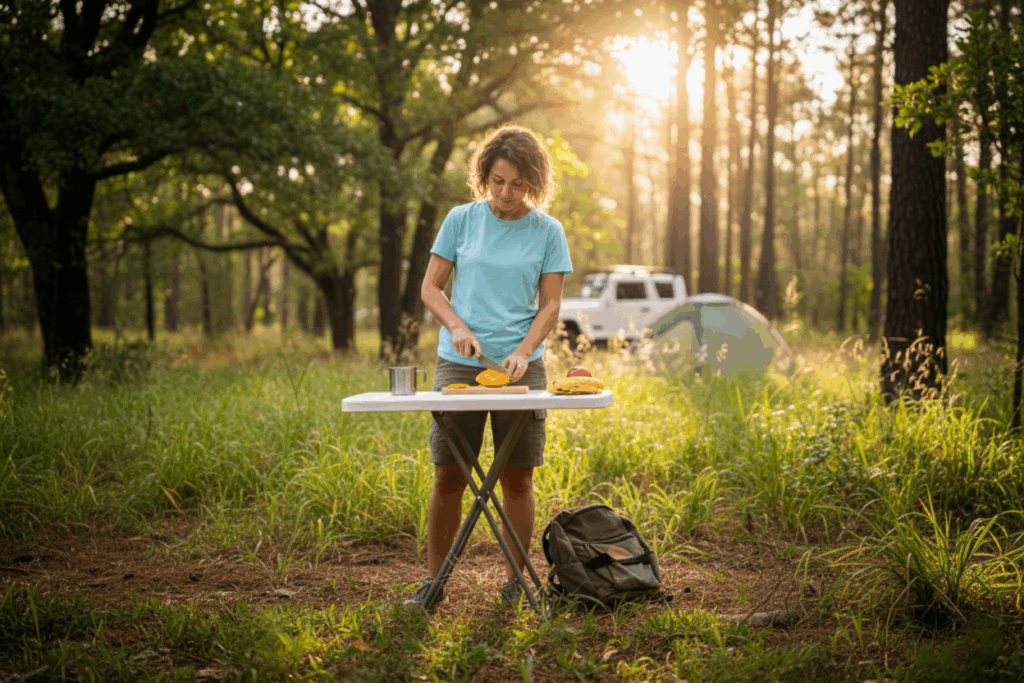 - Mesa Robust 80cm – Compacta, leve (apenas 4,1kg) e com três ajustes de altura (50, 63 e 74cm). Ideal para quem busca versatilidade e mobilidade, é perfeita para refeições rápidas, apoio de equipamentos ou até jogos de tabuleiro durante o camping.